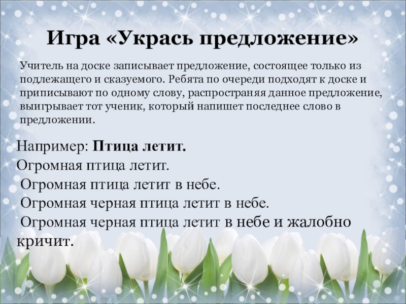 Учитель на доске записывает предложение, состоящее только из подлежащего и сказуемого. Ребята по очереди подходят к доске и приписывают по одному слову, распространяя данное предложение, выигрывает тот ученик, который напишет последнее слово в предложении.