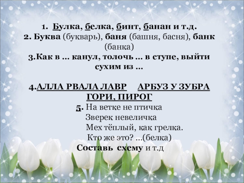 1. Булка, белка, бинт, банан и т.д.