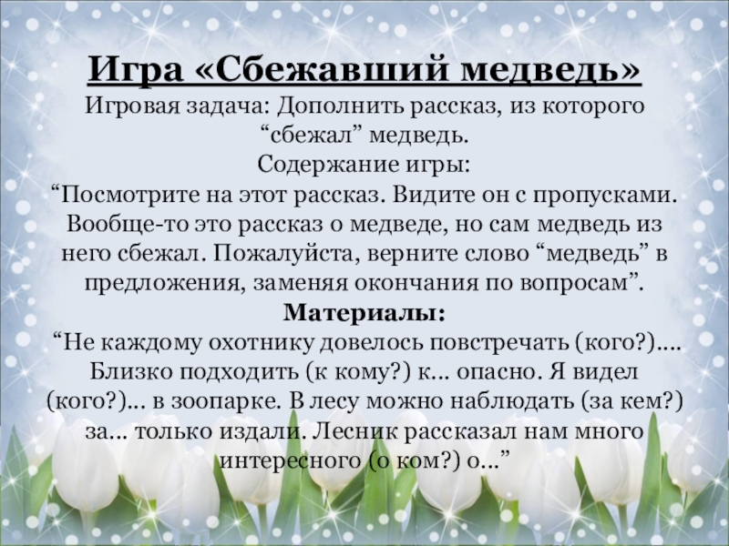 на этот рассказ. Видите он с пропусками. Вообще-то это рассказ о медведе, но сам медведь из него сбежал. Пожалуйста, верните слово “медведь” в предложения, заменяя окончания по вопросам”.