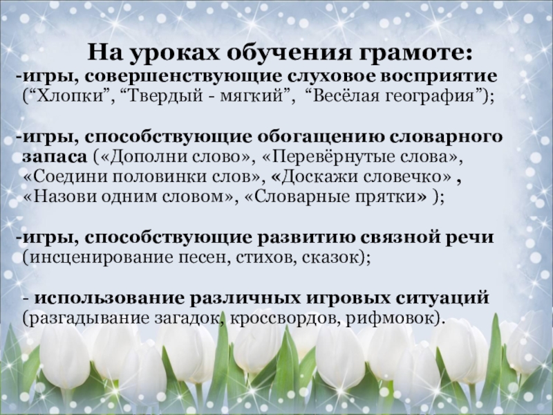 игры, способствующие обогащению словарного запаса («Дополни слово», «Перевёрнутые слова», «Соедини половинки слов», «Доскажи словечко» , «Назови одним словом», «Словарные прятки» );