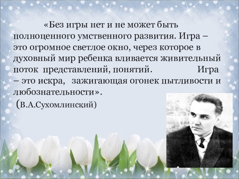 не может быть полноценного умственного развития. Игра – это огромное светлое окно, через которое в духовный мир ребенка вливается живительный поток представлений, понятий. Игра – это искра, зажигающая огонек пытливости и любознательности».