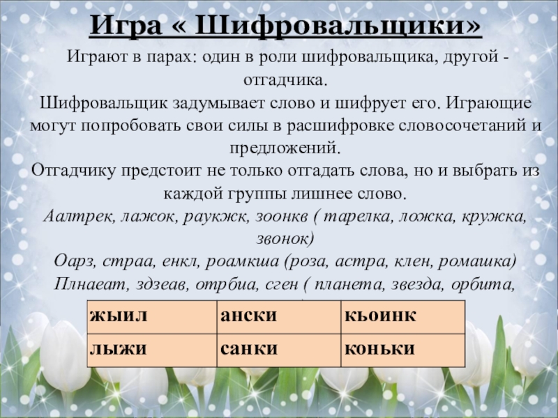 Шифровальщик задумывает слово и шифрует его. Играющие могут попробовать свои силы в расшифровке словосочетаний и предложений.