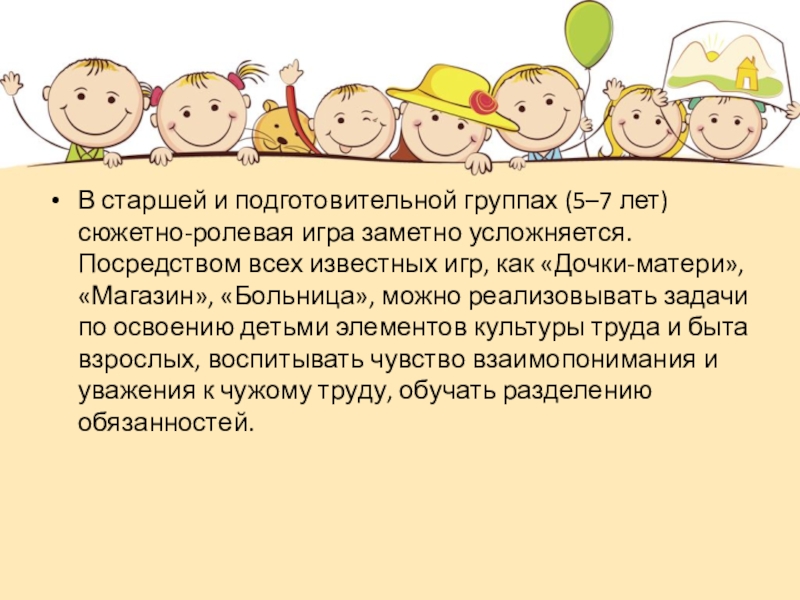 В старшей и подготовительной группах (5–7 лет) сюжетно-ролевая игра заметно усложняется.