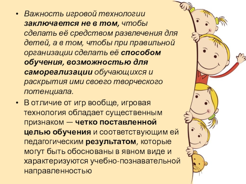 Слайд 7Важность игровой технологии заключается не в том, чтобы сделать её средством