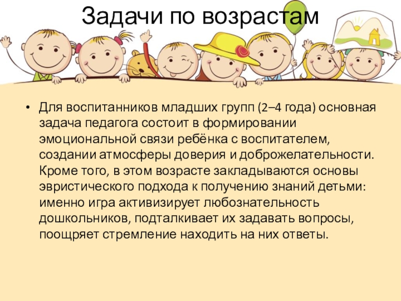 состоит в формировании эмоциональной связи ребёнка с воспитателем, создании атмосферы доверия и доброжелательности. Кроме того, в этом возрасте закладываются основы эвристического подхода к получению знаний детьми: именно игра активизирует любознательность дошкольников, подталкивает их задавать вопросы, поощряет стремление находить на них ответы.
