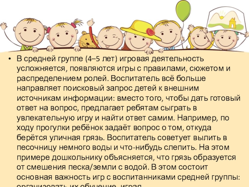 правилами, сюжетом и распределением ролей. Воспитатель всё больше направляет поисковый запрос детей к внешним источникам информации: вместо того, чтобы дать готовый ответ на вопрос, предлагает ребятам сыграть в увлекательную игру и найти ответ самим. Например, по ходу прогулки ребёнок задаёт вопрос о том, откуда берётся уличная грязь. Воспитатель советует вылить в песочницу немного воды и что-нибудь слепить. На этом примере дошкольнику объясняется, что грязь образуется от смешения песка/земли с водой. В этом состоит основная важность игр с воспитанниками средней группы: организовать их обучение, играя