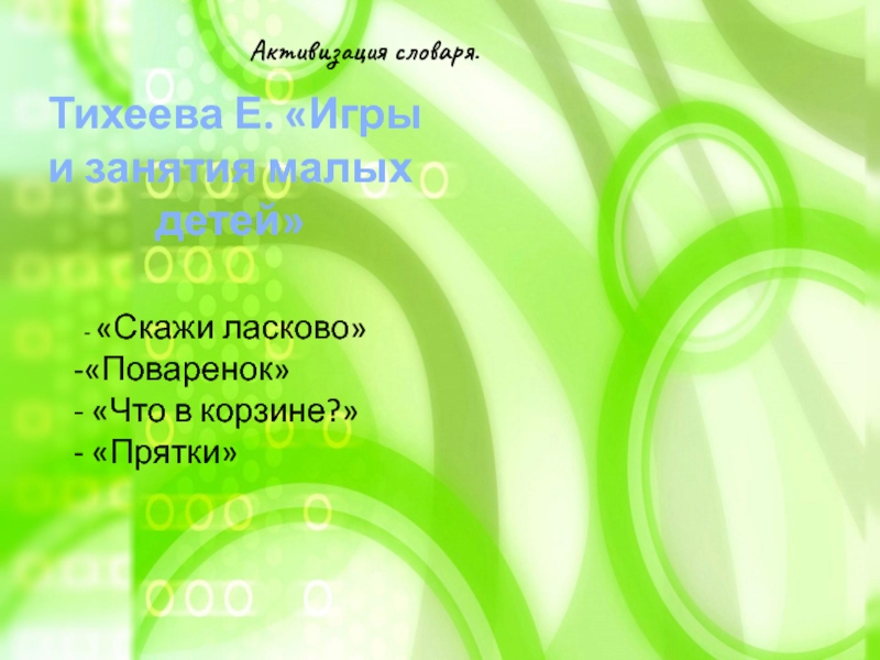 Активизация словаря.Тихеева Е. «Игры и занятия малых детей»- «Скажи ласково»«Поваренок» «Что в корзине?» «Прятки»
