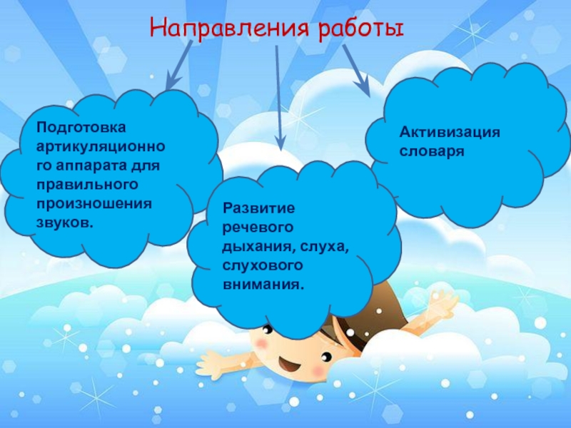 Направления работыПодготовка артикуляционного аппарата для правильного произношения звуков.Активизация словаряРазвитие речевого дыхания, слуха, слухового внимания.
