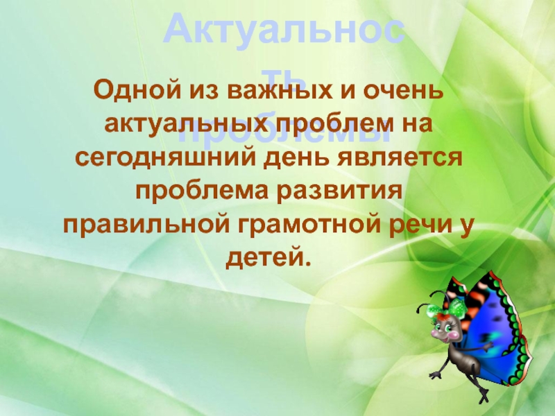 Актуальность проблемы Одной из важных и очень актуальных проблем на сегодняшний день является проблема развития правильной грамотной речи у детей.