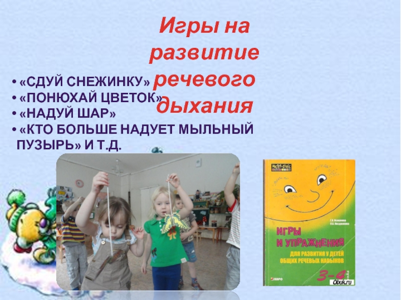 Игры на развитие речевого дыхания «Сдуй снежинку» «Понюхай цветок» «Надуй шар» «Кто больше надует мыльный