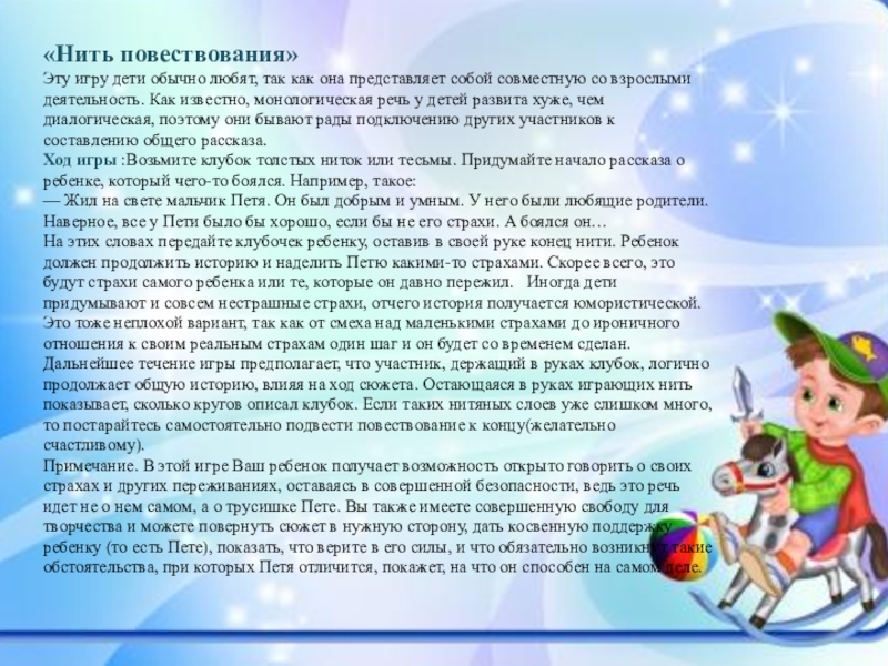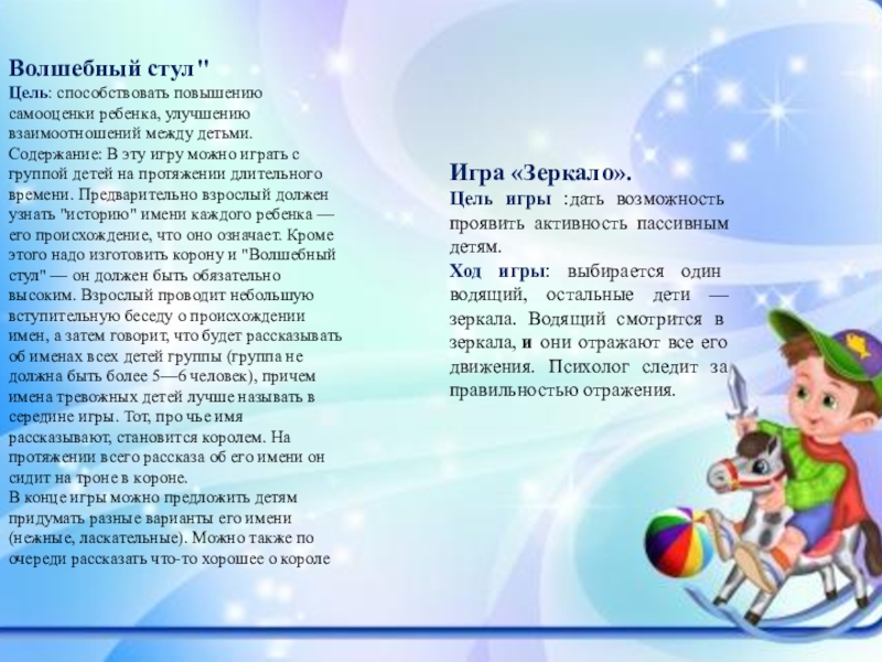Содержание: В эту игру можно играть с группой детей на протяжении длительного времени. Предварительно взрослый должен узнать "историю" имени каждого ребенка — его происхождение, что оно означает. Кроме этого надо изготовить корону и "Волшебный стул" — он должен быть обязательно высоким. Взрослый проводит небольшую вступительную беседу о происхождении имен, а затем говорит, что будет рассказывать об именах всех детей группы (группа не должна быть более 5—6 человек), причем имена тревожных детей лучше называть в середине игры. Тот, про чье имя рассказывают, становится королем. На протяжении всего рассказа об его имени он сидит на троне в короне.