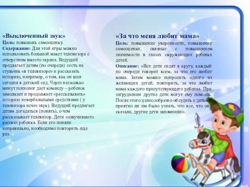 Содержание: Для этой игры можно использовать большой макет телевизора с отверстием вместо экрана. Ведущий предлагает детям (по очереди) сесть на стульчик «в телевизоре» и рассказать историю, например, о том, как он шел сегодня в детский сад. Через несколько минут психолог дает команду – ребенок замолкает и продолжает «рассказывать» историю невербальными средствами ( у телевизора исчез звук). Ведущий предлагает детям догадаться (понять), о чем рассказывает телевизор. Дети «озвучивают» рассказ ребенка. Если его поняли неправильно, необходимо повторить еще раз.