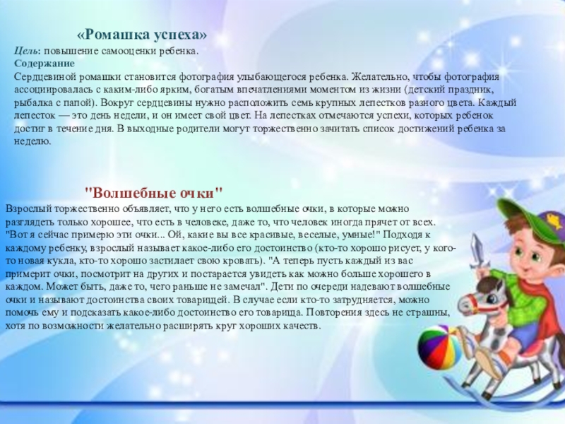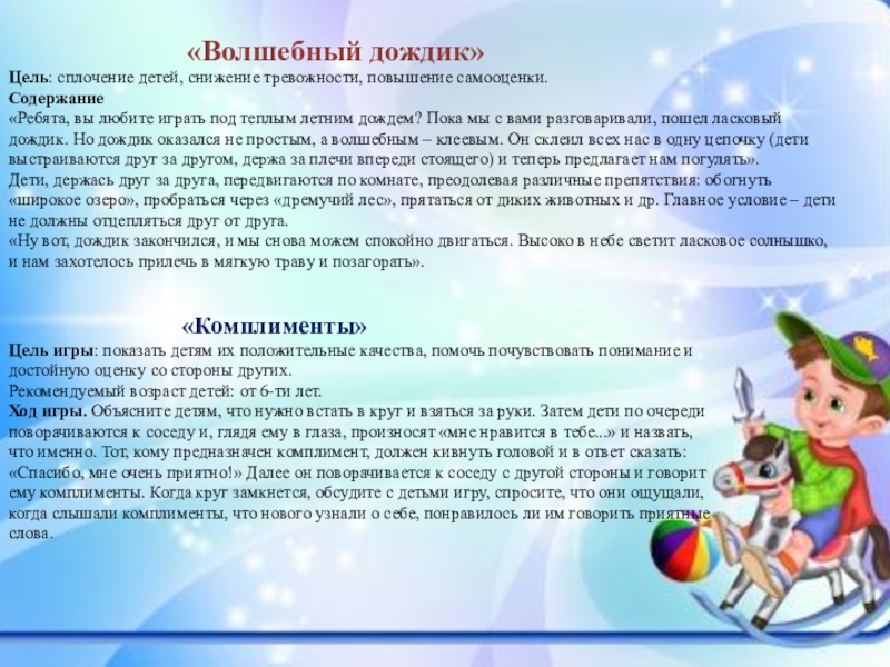 Цель: способствовать повышению самооценки ребенка, улучшению взаимоотношений между детьми.