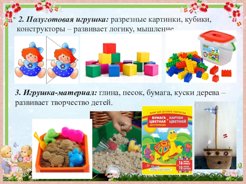 3. Игрушка-материал: глина, песок, бумага, куски дерева – развивает творчество детей.