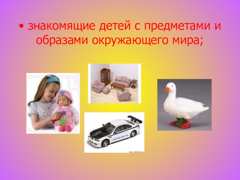 • знакомящие детей с предметами и образами окружающего мира;