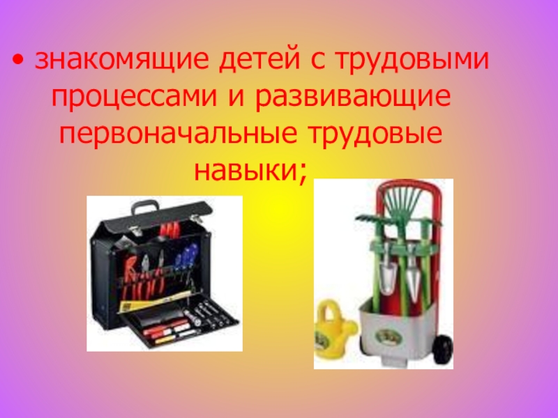 Слайд 7• знакомящие детей с трудовыми процессами и развивающие первоначальные трудовые навыки;