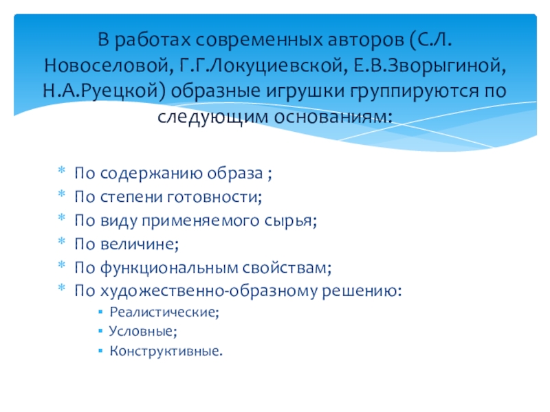 В работах современных авторов (С.Л.Новоселовой, Г.Г.Локуциевской, Е.В.Зворыгиной, Н.А.Руецкой) образные игрушки группируются по следующим основаниям: