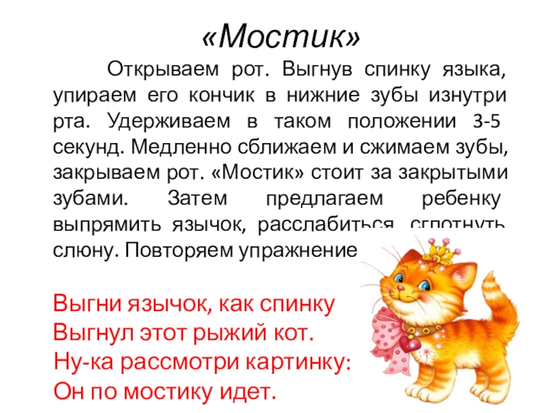 в нижние зубы изнутри рта. Удерживаем в таком положении 3-5 секунд. Медленно сближаем и сжимаем зубы, закрываем рот. «Мостик» стоит за закрытыми зубами. Затем предлагаем ребенку выпрямить язычок, расслабиться, сглотнуть слюну. Повторяем упражнение 3-4 раза.