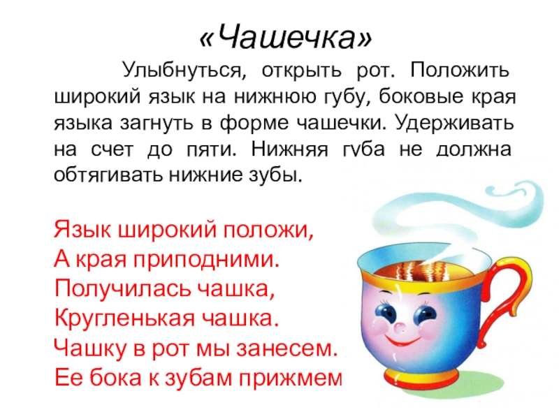 «Чашечка»   Улыбнуться, открыть рот. Положить широкий язык на нижнюю губу, боковые края языка загнуть в