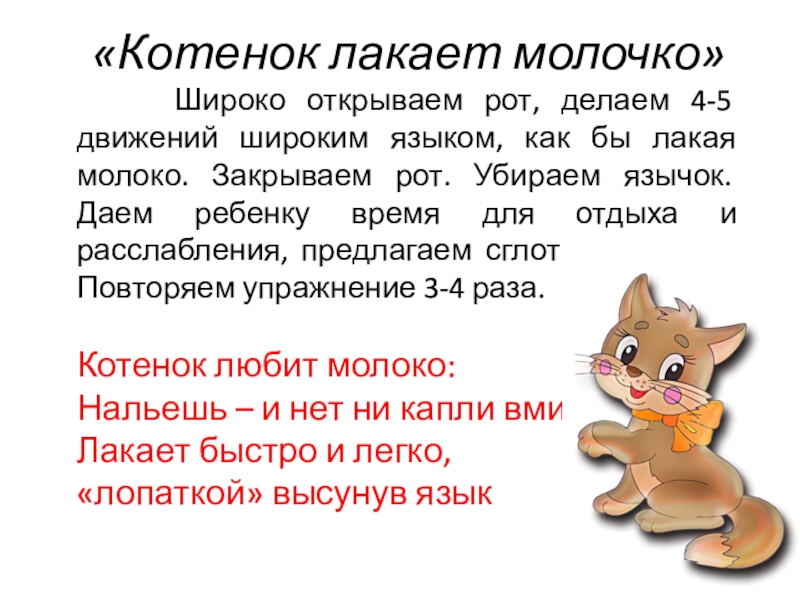 «Котенок лакает молочко»   Широко открываем рот, делаем 4-5 движений широким языком, как бы лакая молоко.