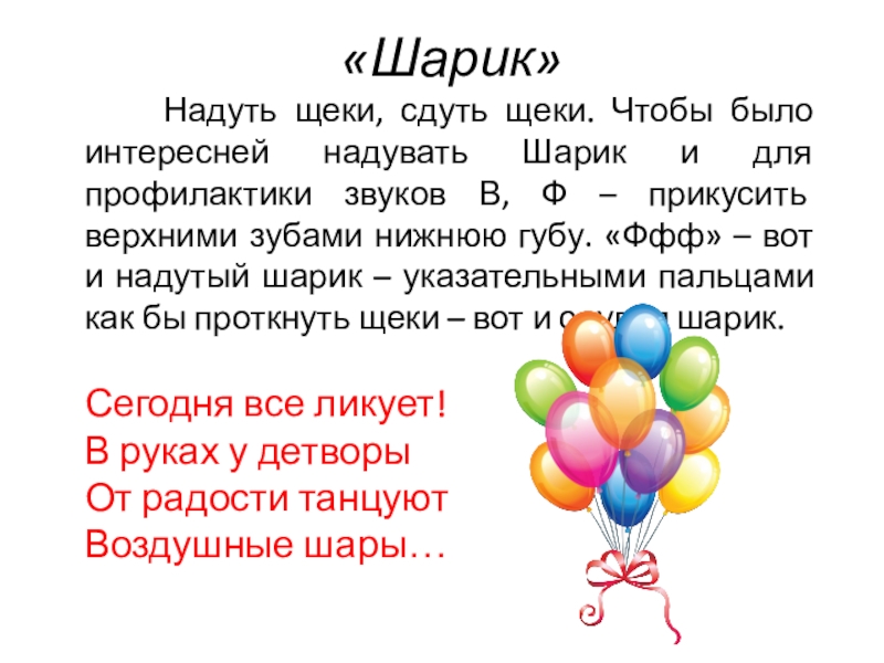 Шарик и для профилактики звуков В, Ф – прикусить верхними зубами нижнюю губу. «Ффф» – вот и надутый шарик – указательными пальцами как бы проткнуть щеки – вот и сдулся шарик.