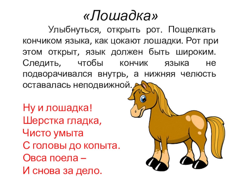 лошадки. Рот при этом открыт, язык должен быть широким. Следить, чтобы кончик языка не подворачивался внутрь, а нижняя челюсть оставалась неподвижной.