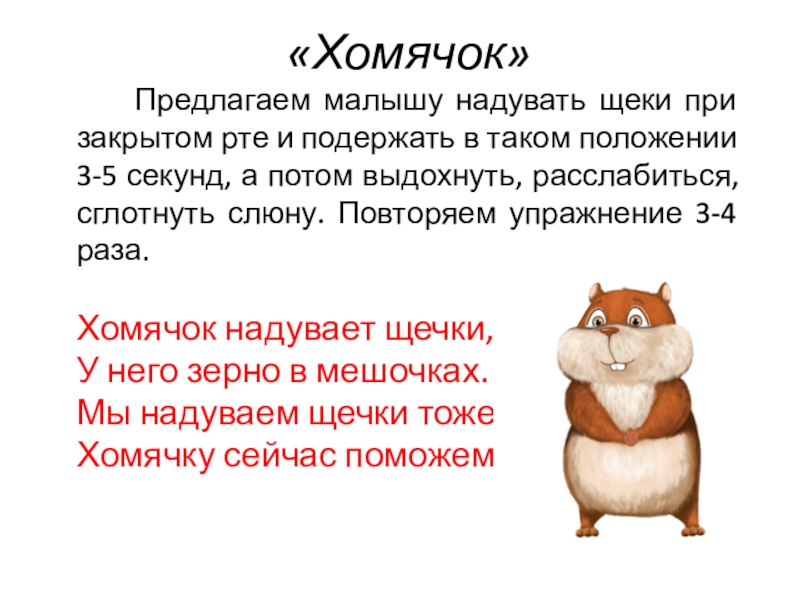 «Хомячок»   Предлагаем малышу надувать щеки при закрытом рте и подержать в таком положении 3-5 секунд,