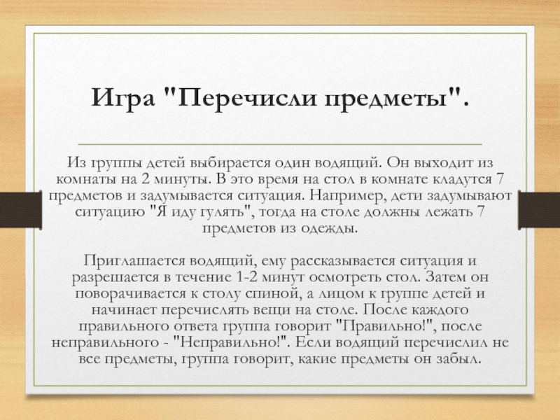Приглашается водящий, ему рассказывается ситуация и разрешается в течение 1-2 минут осмотреть стол. Затем он поворачивается к столу спиной, а лицом к группе детей и начинает перечислять вещи на столе. После каждого правильного ответа группа говорит "Правильно!", после неправильного - "Неправильно!". Если водящий перечислил не все предметы, группа говорит, какие предметы он забыл.
