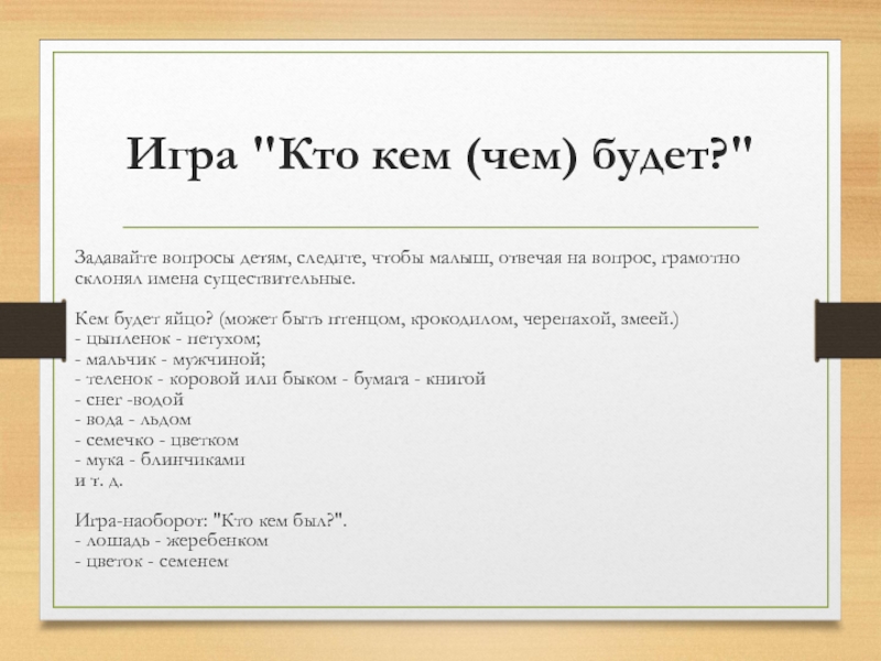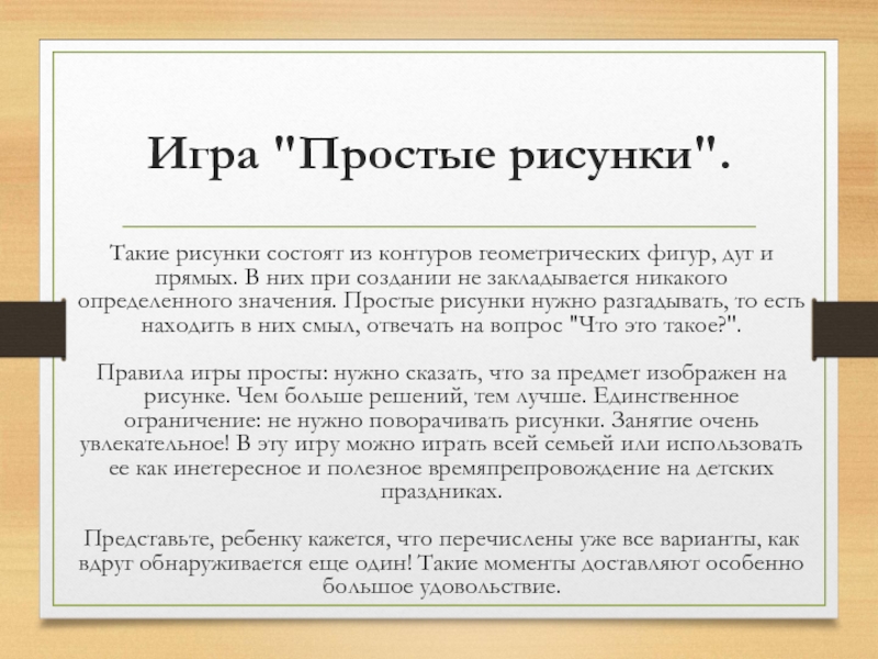 Правила игры просты: нужно сказать, что за предмет изображен на рисунке. Чем больше решений, тем лучше. Единственное ограничение: не нужно поворачивать рисунки. Занятие очень увлекательное! В эту игру можно играть всей семьей или использовать ее как инетересное и полезное времяпрепровождение на детских праздниках.
