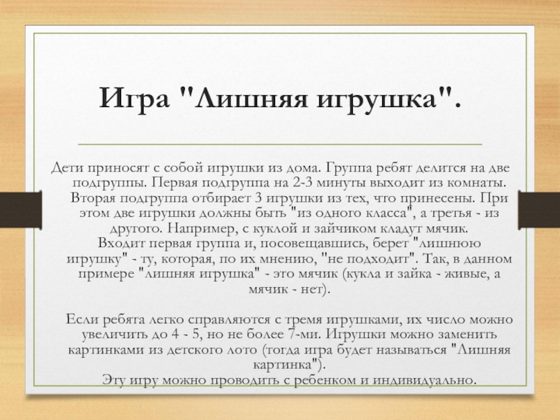 делится на две подгруппы. Первая подгруппа на 2-3 минуты выходит из комнаты. Вторая подгруппа отбирает 3 игрушки из тех, что принесены. При этом две игрушки должны быть "из одного класса", а третья - из другого. Например, с куклой и зайчиком кладут мячик.