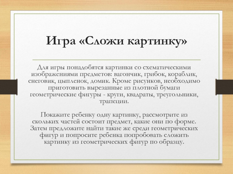 грибок, кораблик, снеговик, цыпленок, домик. Кроме рисунков, необходимо приготовить вырезанные из плотной бумаги геометрические фигуры - круги, квадраты, треугольники, трапеции.
