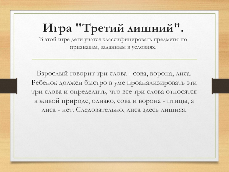 Взрослый говорит три слова - сова, ворона, лиса. Ребенок должен быстро в уме проанализировать эти три слова и определить, что все три слова относятся к живой природе, однако, сова и ворона - птицы, а лиса - нет. Следовательно, лиса здесь лишняя.