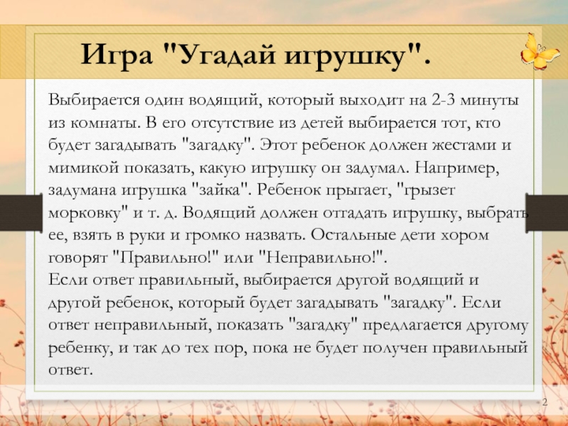 комнаты. В его отсутствие из детей выбирается тот, кто будет загадывать "загадку". Этот ребенок должен жестами и мимикой показать, какую игрушку он задумал. Например, задумана игрушка "зайка". Ребенок прыгает, "грызет морковку" и т. д. Водящий должен отгадать игрушку, выбрать ее, взять в руки и громко назвать. Остальные дети хором говорят "Правильно!" или "Неправильно!".