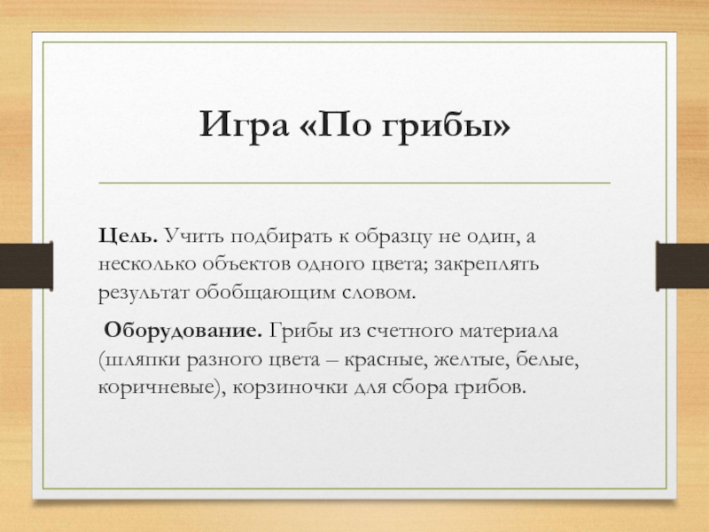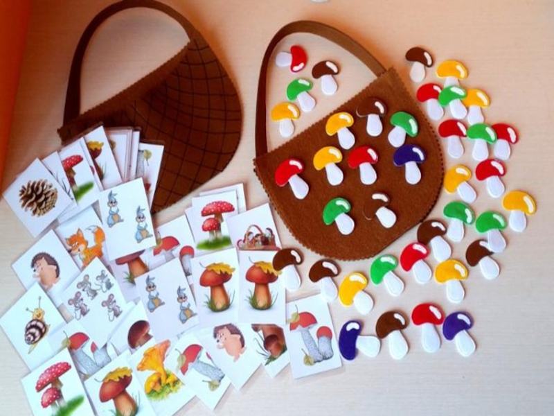 на полу грибы двух цветов, например красные и желтые. Берет две корзиночки и в одну из них кладет гриб с красной шляпкой, в другую – с желтой. Отдает корзинки двум детям и просит собрать в них «такие» грибы, какие лежат в корзинках. Дети собирают грибы, а остальные наблюдают за их действиями. Затем дети показывают, кто что собрал в корзинку, и результат обобщается в слове – «все красные», «все желтые».
