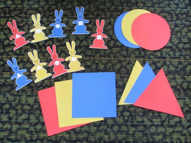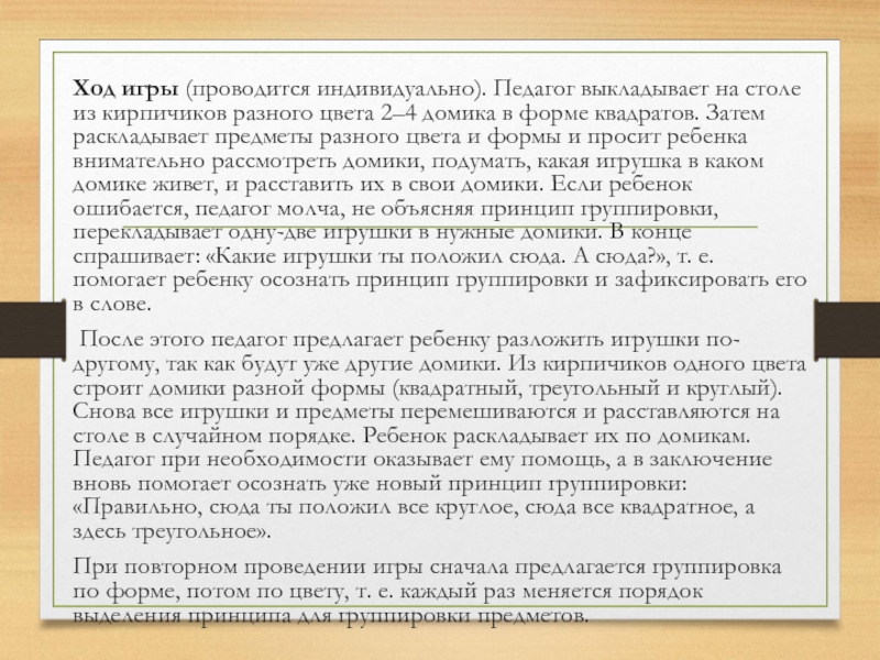 цвета 2–4 домика в форме квадратов. Затем раскладывает предметы разного цвета и формы и просит ребенка внимательно рассмотреть домики, подумать, какая игрушка в каком домике живет, и расставить их в свои домики. Если ребенок ошибается, педагог молча, не объясняя принцип группировки, перекладывает одну-две игрушки в нужные домики. В конце спрашивает: «Какие игрушки ты положил сюда. А сюда?», т. е. помогает ребенку осознать принцип группировки и зафиксировать его в слове.