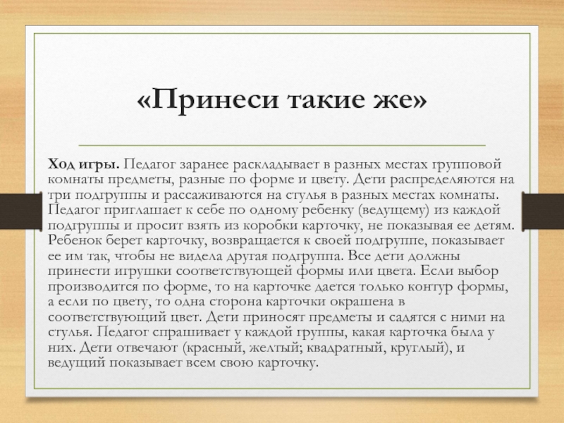 комнаты предметы, разные по форме и цвету. Дети распределяются на три подгруппы и рассаживаются на стулья в разных местах комнаты. Педагог приглашает к себе по одному ребенку (ведущему) из каждой подгруппы и просит взять из коробки карточку, не показывая ее детям. Ребенок берет карточку, возвращается к своей подгруппе, показывает ее им так, чтобы не видела другая подгруппа. Все дети должны принести игрушки соответствующей формы или цвета. Если выбор производится по форме, то на карточке дается только контур формы, а если по цвету, то одна сторона карточки окрашена в соответствующий цвет. Дети приносят предметы и садятся с ними на стулья. Педагог спрашивает у каждой группы, какая карточка была у них. Дети отвечают (красный, желтый; квадратный, круглый), и ведущий показывает всем свою карточку.