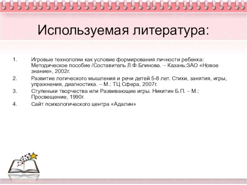 Развитие логического мышления и речи детей 5-8 лет. Стихи, занятия, игры, упражнения, диагностика. – М.: ТЦ Сфера, 2007г.