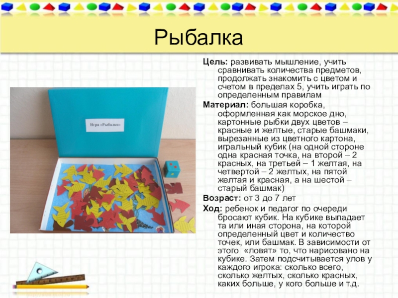 Ход: ребенок и педагог по очереди бросают кубик. На кубике выпадает та или иная сторона, на которой определенный цвет и количество точек, или башмак. В зависимости от этого «ловят» то, что нарисовано на кубике. Затем подсчитывается улов у каждого игрока: сколько всего, сколько желтых, сколько красных, каких больше, у кого больше и т.д.