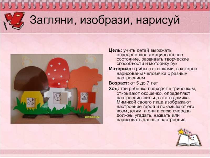 Ход: три ребенка подходят к грибочкам, открывают окошечко, определяют настроение жильца этого домика. Мимикой своего лица изображают настроение героя и показывают его всем детям, а они в свою очередь должны угадать, назвать или нарисовать данные настроения.