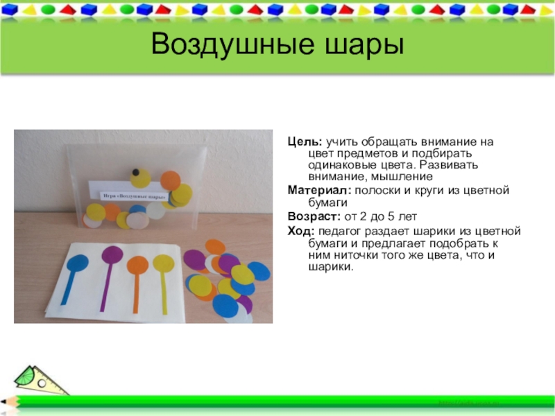 Ход: педагог раздает шарики из цветной бумаги и предлагает подобрать к ним ниточки того же цвета, что и шарики.