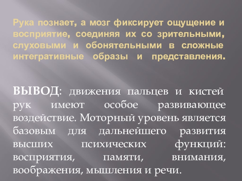 ВЫВОД: движения пальцев и кистей рук имеют особое развивающее воздействие. Моторный уровень является базовым для дальнейшего развития высших психических функций: восприятия, памяти, внимания, воображения, мышления и речи.