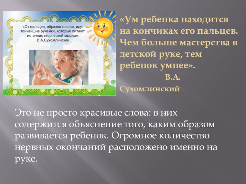 Это не просто красивые слова: в них содержится объяснение того, каким образом развивается ребенок. Огромное количество нервных окончаний расположено именно на руке.