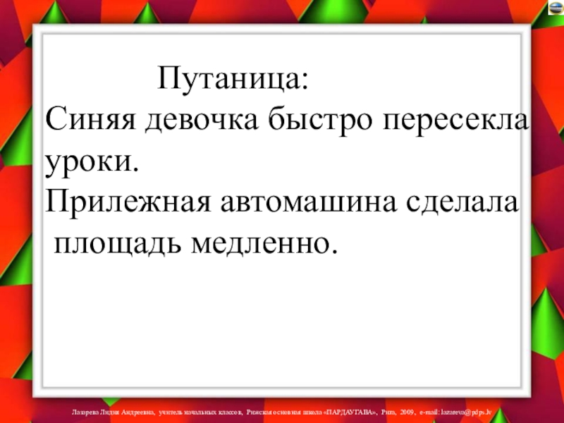 Путаница:Синяя девочка быстро пересекла уроки.Прилежная автомашина сделала площадь медленно.