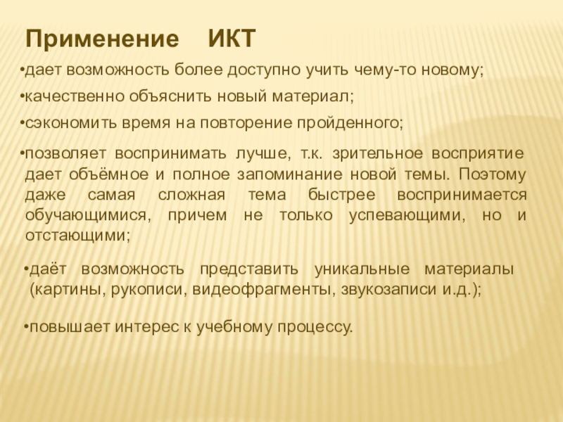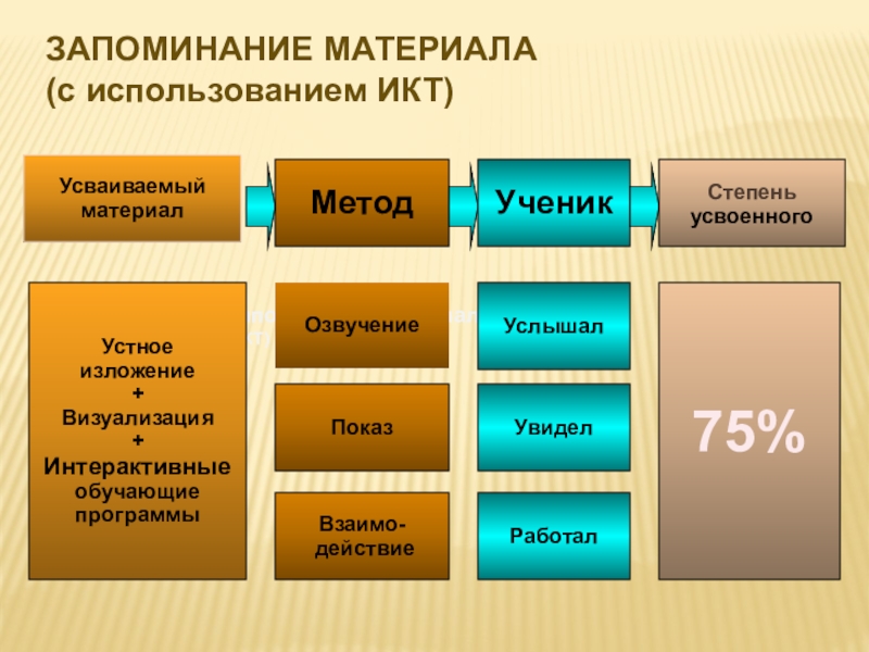 позволяет воспринимать лучше, т.к. зрительное восприятие дает объёмное и полное запоминание новой темы. Поэтому даже самая сложная тема быстрее воспринимается обучающимися, причем не только успевающими, но и отстающими;