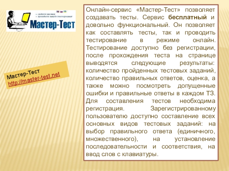 Это сайт презентаций, где можно хранить и обмениваться своими презентациями, докладами, проектами, шаблонами в формате PowerPoint с другими пользователями. Мы помогаем школьникам, студентам, учителям, преподавателям хранить и обмениваться учебными материалами.