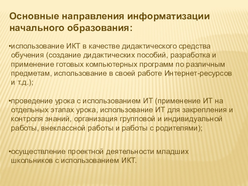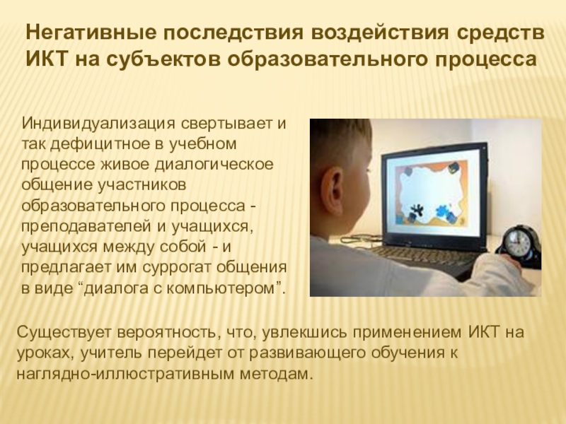 Существует вероятность, что, увлекшись применением ИКТ на уроках, учитель перейдет от развивающего обучения к наглядно-иллюстративным методам.