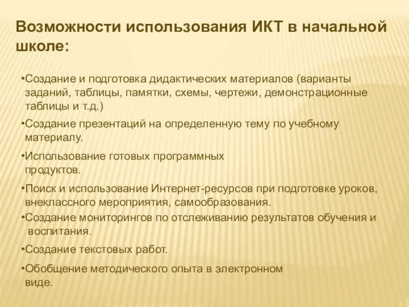 проведение урока с использованием ИТ (применение ИТ на отдельных этапах урока, использование ИТ для закрепления и контроля знаний, организация групповой и индивидуальной работы, внеклассной работы и работы с родителями);