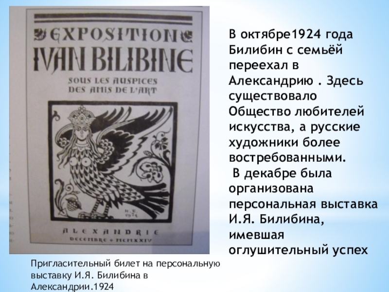 Пригласительный билет на персональную выставку И.Я. Билибина в Александрии.1924