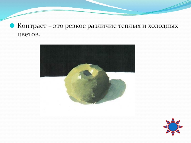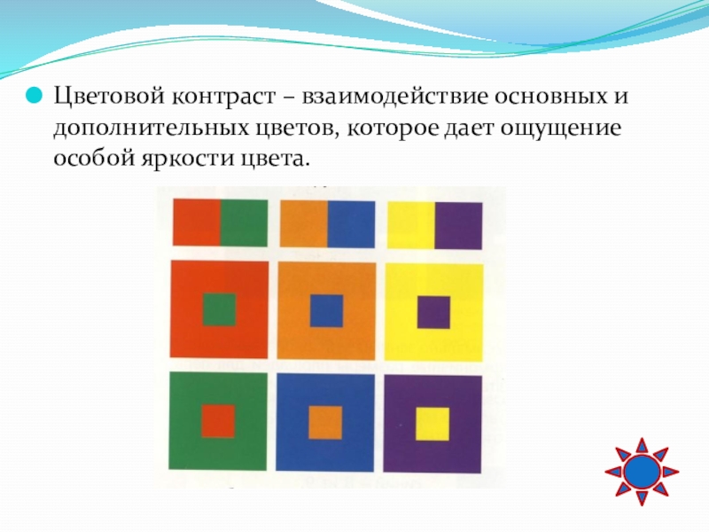 Слайд 33Цветовой контраст – взаимодействие основных и дополнительных цветов, которое дает ощущение