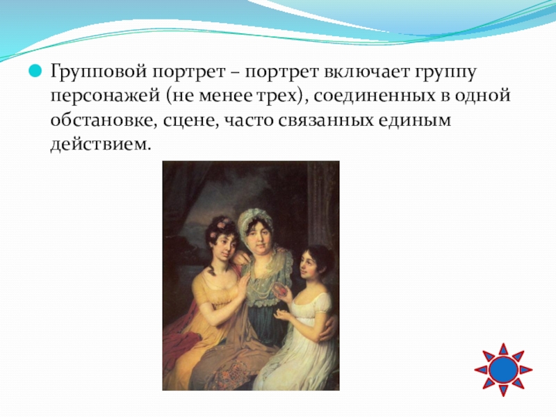 Слайд 66Групповой портрет – портрет включает группу персонажей (не менее трех), соединенных